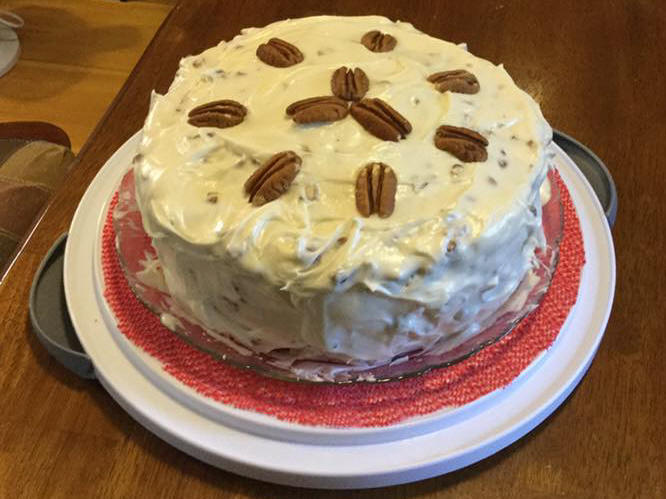 Cream butter and cheese, add vanilla and sugar, mix well add nuts and spread on cake.